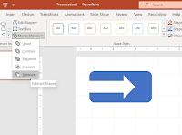 Jika anda sering membuat bentuk objek, lalu menggabungkan 2 objek bersama-sama untuk membuat objek yang baru dalam 1 bentuk, anda dapat menggunakan alat Merge Shape PowerPoint. Contohnya kita ingin membuat kotak dengan bentuk objek panah di tengahnya. Mulailah dengan membuat bentuk kotak dan bentuk panah secara terpisah, lalu klik salah satu objek, maka menu Format Shape akan tampil. Pindahkan bentuk panah persis ditengah bentuk kotak atau dipoisi yang anda inginkan lalu anda klik / pilih kedua objek sambil menekan tombol SHIFT, akan tampil menu Merge Shape.